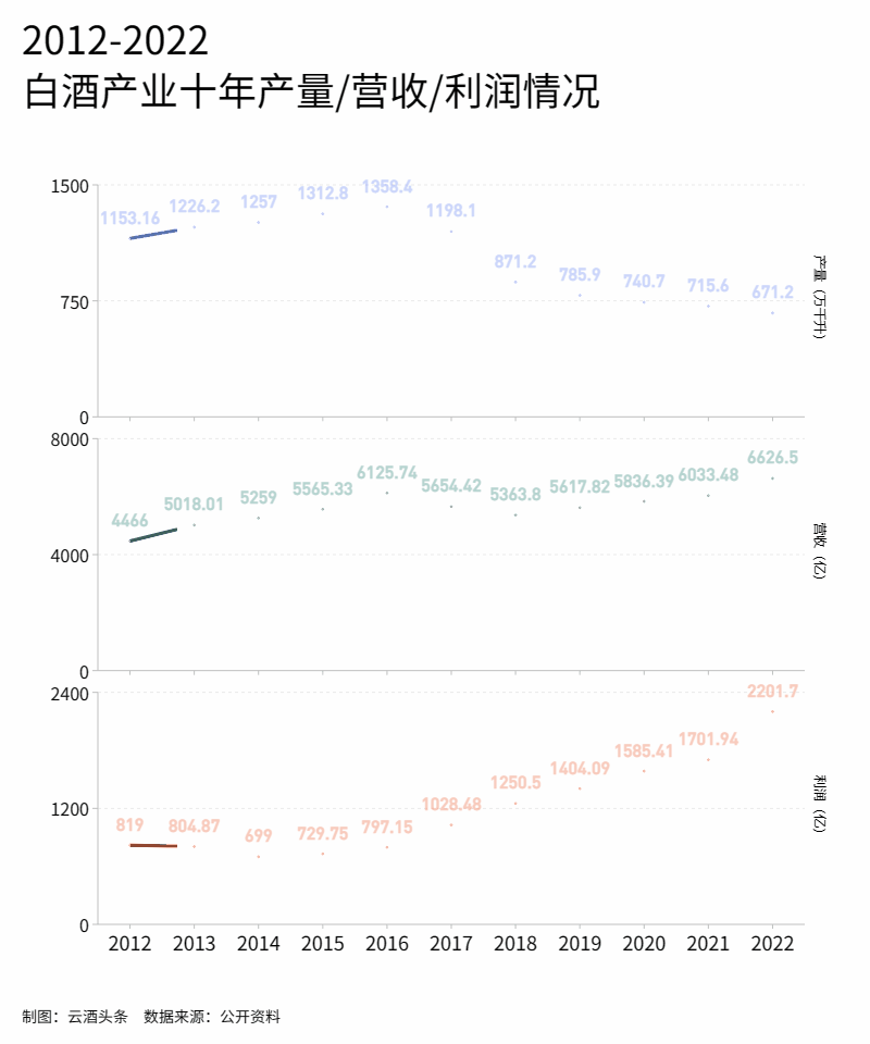 从全国范围来看,从2012年到2022年,白酒整体营收从4466亿元增至6626.5亿元,利润从819亿元增至2201.7亿元,分别增长了48%、168%。而川酒增长均超过100%,营收增幅远超行业,利润增幅与行业基本持平。