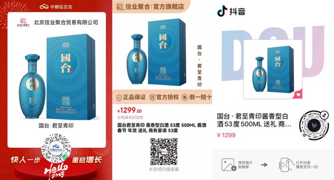 线上,北京信业聚合于2022年5月,正式上线京东、天猫、抖音等电商平台,深度链接消费者,开启线上销售,并借势抖音KOL强势推广,助力扩大国台·君至青印的产品声量。此外,北京信业聚合于今年上线“华糖云交会·线上春糖”平台,实现了企业及产品在经销商面前的多维度曝光。据悉,国台·君至青印已经成为“酱酒馆”中热度极高的产品之一,其店铺意向留言天天刷新纪录,成为全国经销商热选的酱酒品牌。