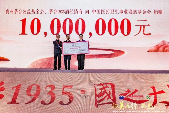 此次,茅台1935酒经销商自愿募集1000万元,并在活动现场,由贵州茅台酒股份有限公司党委委员、副总经理王晓维,贵州茅台酱香系列酒顾问团秘书长、河北飞天进出口有限公司董事长李秋水代表贵州茅台公益基金会、茅台1935酒经销商向中国医药卫生事业发展基金会捐赠1000万元。