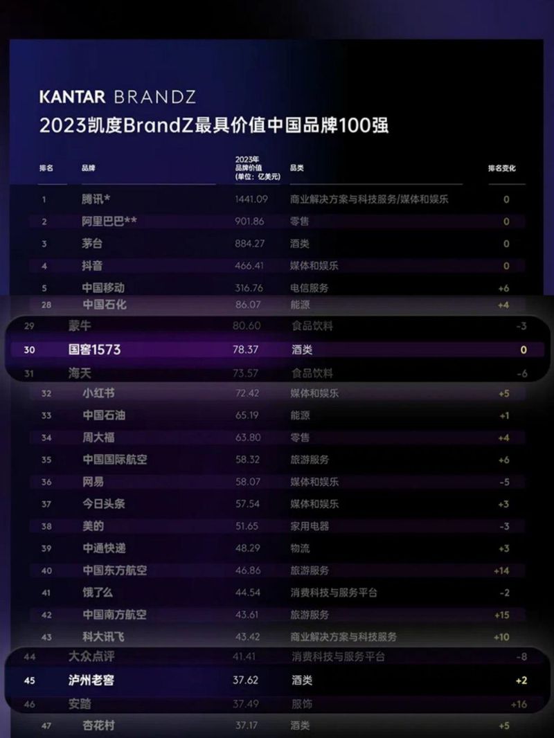 近日,凯度集团正式发布2023年凯度BrandZ最具价值中国品牌100强榜单及完整报告。其中,泸州老窖旗下“国窖1573”品牌和“泸州老窖”品牌,分别以78.37亿美元的品牌价值和37.62亿美元的品牌价值,拿下白酒品牌的第三名和第四名。