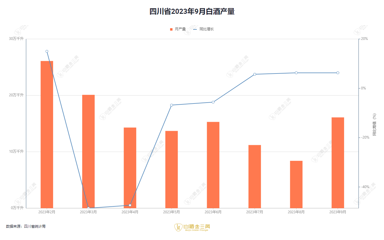 四川省2023年9月白酒产量16.1万千升,同比增长6.3%2023年10月19日四川省统计局发布2023年前三季度四川省国民经济主要指标数据。其中白酒数据:9月白酒产量16.1万千升,同比增长6.3%;1-9月白酒累计产量114.4万千升,累计下降12.1%;