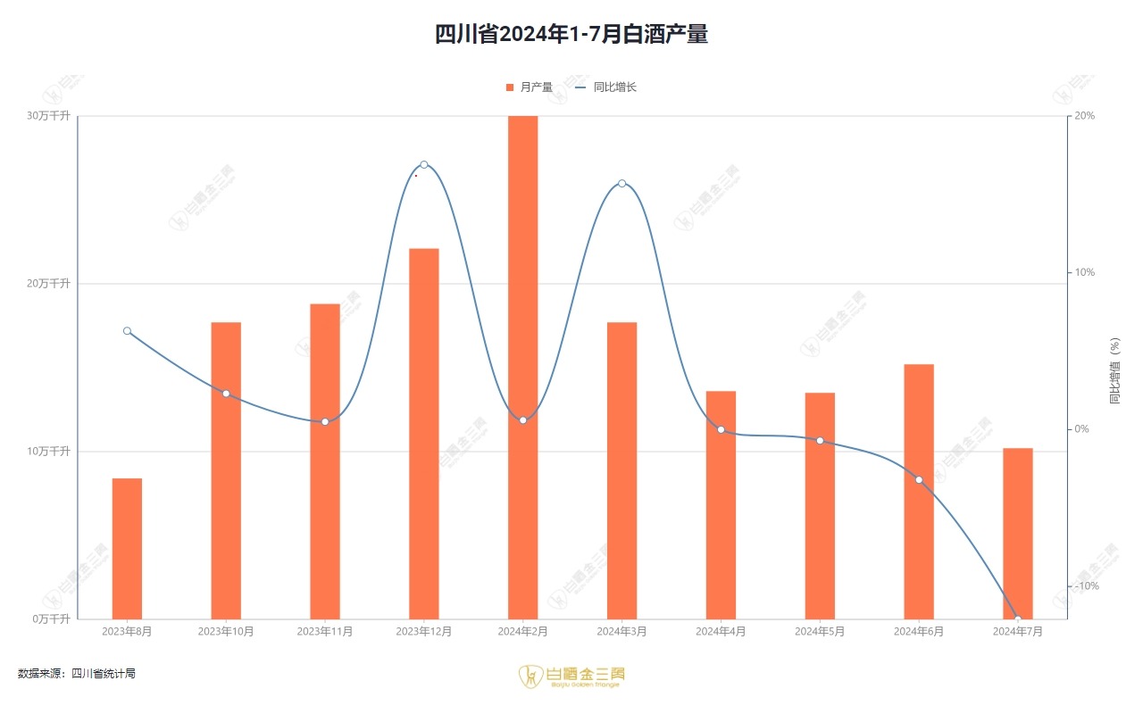 四川省2024年7月白酒产量10.2万千升,同比下降12.1%2024年8月16日四川省统计局发布2024年1-7月四川省国民经济主要指标数据。其中白酒数据:7月白酒产量10.2万千升,同比下降12.1%;1-7月白酒累计产量83.4万千升,累计下降9.4%;