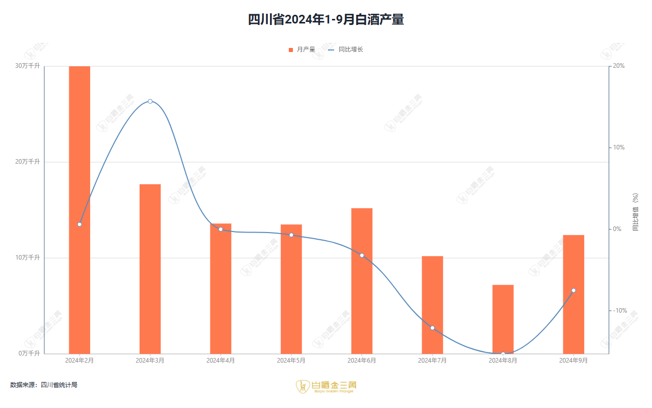 四川省2024年9月白酒产量12.4万千升,同比下降7.5%2024年10月21日四川省统计局发布2024年1-9月四川省国民经济主要指标数据。其中白酒数据:9月白酒产量12.4万千升,同比下降7.5%;1 - 9月白酒累计产量97.4万千升,累计下降0.1%;