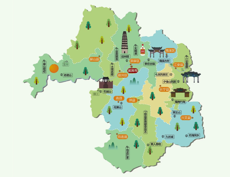 宜宾古称“叙州”“戎州”,素有“万里长江第一城”“中国酒都”“中华竹都”的美誉。拥有深厚的文化底蕴,有3000多年茶叶生产史、4000多年酿酒史,是世界名酒五粮液的产地。宜宾历史与文化荟萃,自然与人文交融,积聚了多姿多彩的长江文化、茶文化、酒文化、僰苗文化等