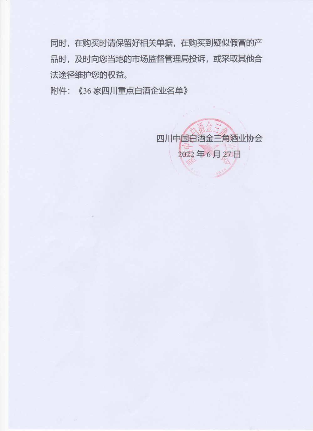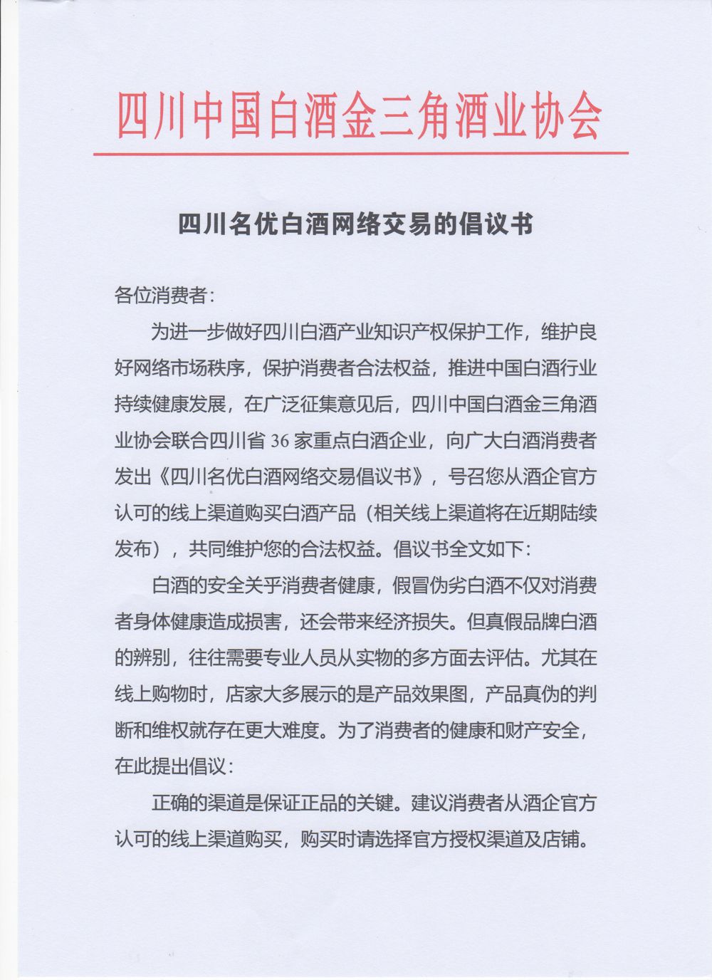 为进一步做好四川白酒产业知识产权保护工作,维护良好网络市场秩序,保护消费者合法权益,推进中国白酒行业持续健康发展,在广泛征集意见后,四川中国白酒金三角酒业协会联合四川省36家重点白酒企业,向广大白酒消费者发出《四川名优白酒网络交易倡议书》,号召您从酒企官方认可的线上渠道购买白酒产品(相关线上渠道将在近期陆续发布),共同维护您的合法权益。倡议书全文如下∶