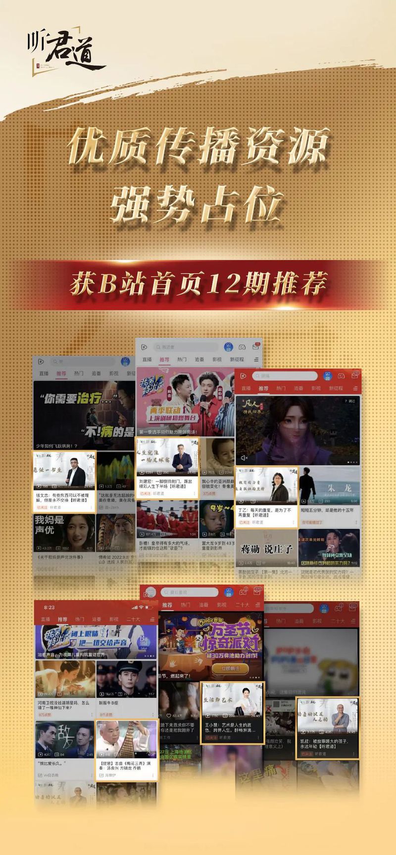 全平台收看量8000万+、单集爆款收看量700W+、获得B站12期首页推荐,这是君道贵酿文化IP《听君道》第一季的线上播放数据;在线下,《听君道》海陆空点位齐发,在上海外滩之窗、虹桥枢纽大屏、航空荧屏电视霸屏传播,多渠道覆盖,君道贵酿的知名度和认可度都得到了显著提升。