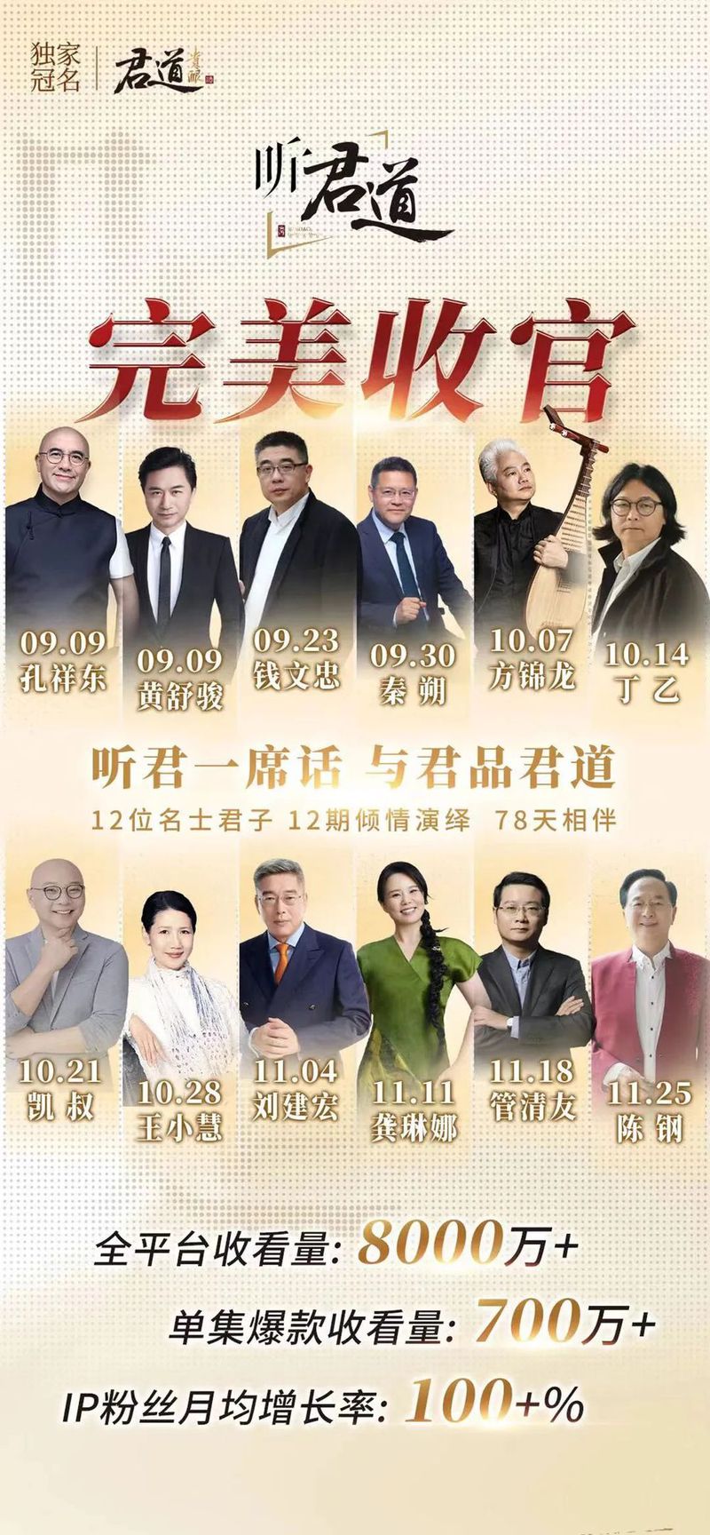 11月25日,君道贵酿文化IP《听君道》第一季完成最后一期节目播出。从9月9日登陆外滩之窗起到现在完美收官,两个多月的时间跨度里,12期节目,来自文化、艺术、财经等领域的12位当代名士的12场精彩对话,带领观众穿越点滴往昔,探寻君子的成长足迹。