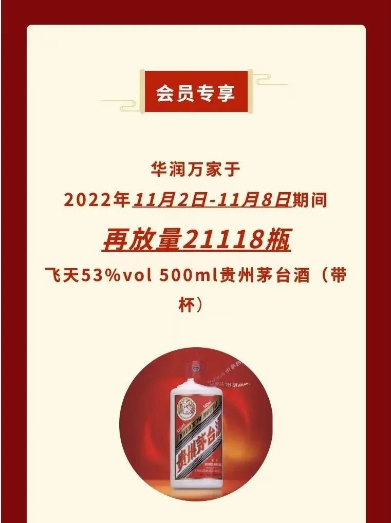 10月26日,华润苏果超市官方公众号发布“乐享茅台酒”万家会员节活动。