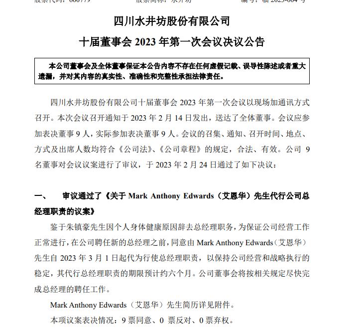 2月24日下午,水井坊发布十届董事会 2023 年第一次会议决议公告。公告显示同意由 Mark Anthony Edwards(艾恩华)先生自 2023 年 3 月 1 日起代为行使总经理职责,以保持公司经营和战略执行的稳定,其代行总经理职责的期限预计约六个月,公司董事会将按相关规定尽快完成总经理的聘任工作。