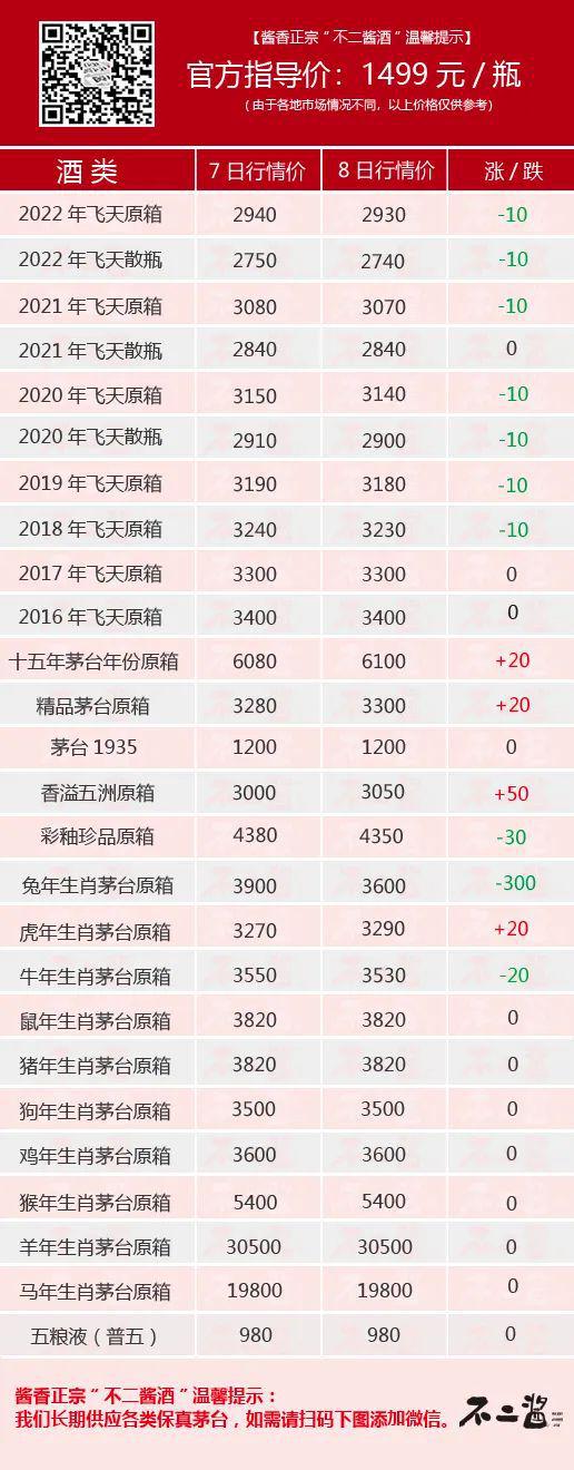 今日茅台酒行情价全览。飞天方面,2018~2022年原箱及2020、2022年散瓶跌10元/瓶;生肖方面,兔年再跌300元/瓶,虎年涨20元/瓶,牛年跌20元/瓶;其他系列中,十五年,精品有20元/瓶的涨幅,香溢五洲大涨50元/瓶;彩釉跌30元/瓶。