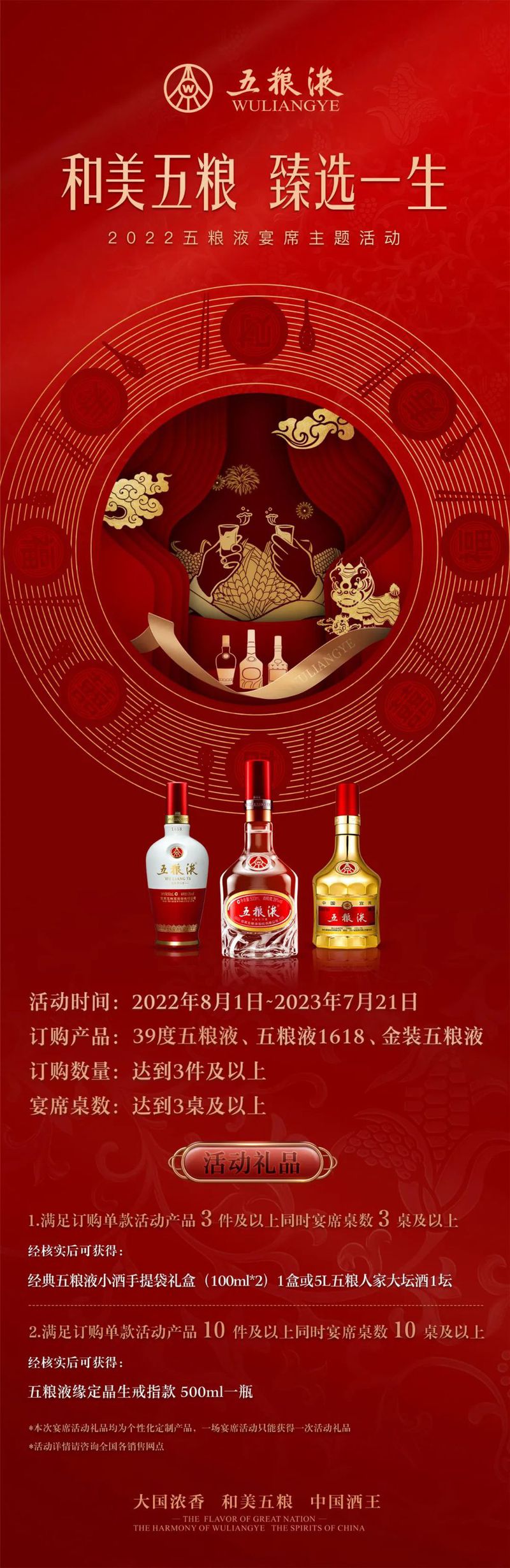 此外,2022年8月1日至2023年7月21日,订购39度五粮液、五粮液1618、金装五粮液3件及以上,同时宴席桌数3桌及以上,可获得经典五粮液小酒手提袋礼盒(100ml*2)1盒或5L五粮人家大坛酒1坛;满足订购单款活动产品10件及以上,同时宴席桌数在10桌及以上的,还可获得五粮液缘定晶生戒指款500ml一瓶。