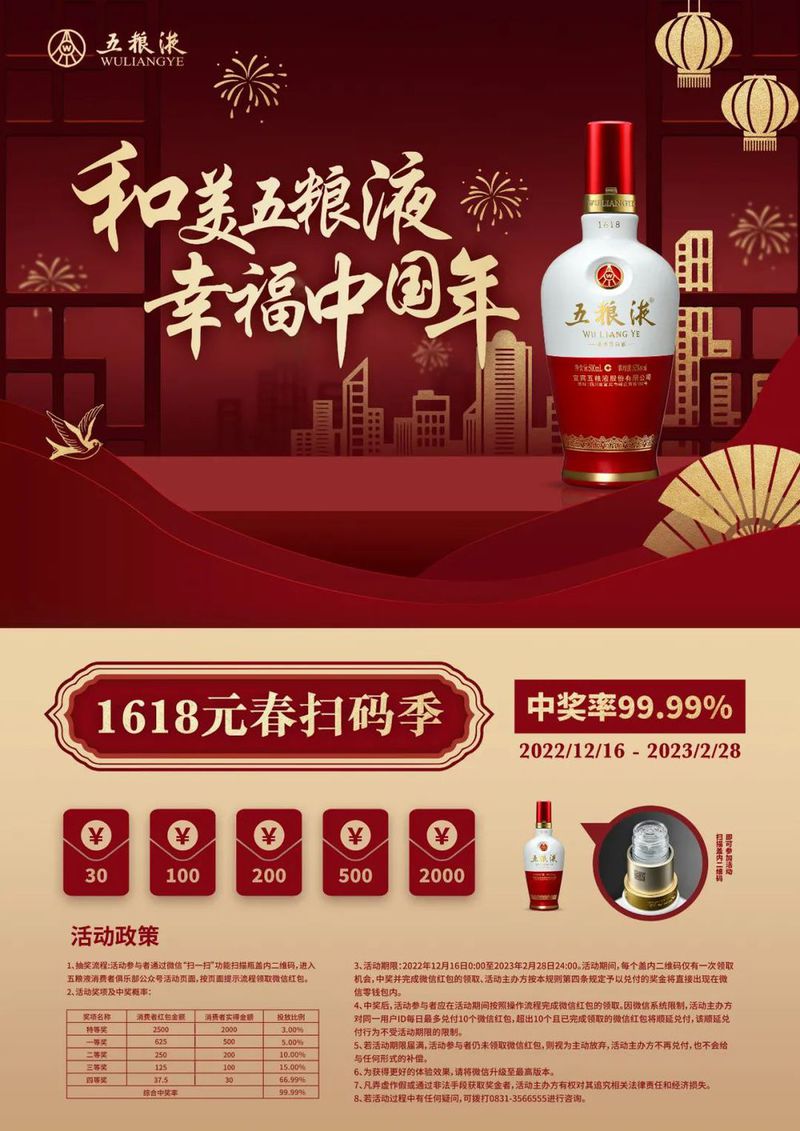 在此情况下,五粮液的“开瓶扫码季”活动成为了消费市场复苏的重要抓手。五粮液“元春开瓶扫码季”活动已于近日启动,消费者购买五粮液1618、39度五粮液,开瓶扫盖内码,便有99.99%的概率获得红包,大奖最高至2000元。