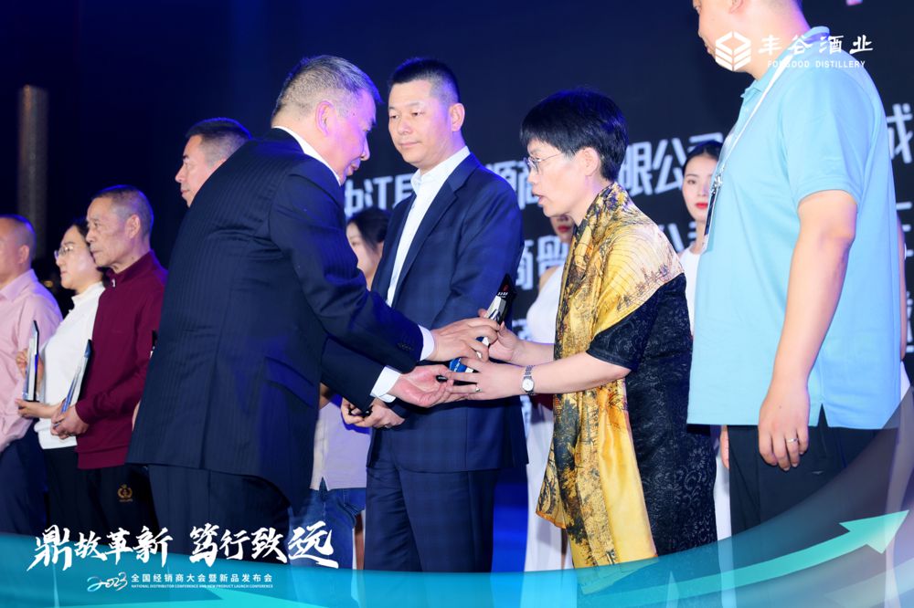 同时,丰谷酒业发布酒王系列新品“酒王珍藏20”和“酒王私藏30”,以及曲酒系列新品“丰谷特曲”,分别定位次高端和端市场。大会现场还对常年合作的经销商伙伴们进行了颁奖授勋。