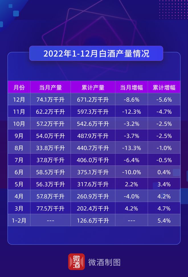 近期,国家统计局发布数据显示:2022年,全国白酒产量为671.2万千升,同比下滑5.6%。白酒产量延续了负增长的态势,且下滑幅度较2021年(-0.59%)更大。