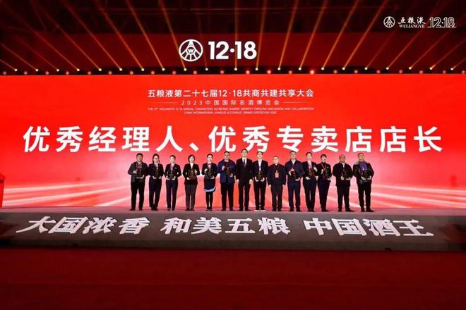 对共建共商的经销商们,五粮液给予荣誉的同时还共享了丰厚的奖励。大会通报了2023年度五粮液品牌运营商表彰奖励及市场支持决定,五粮液股份公司副董事长张宇宣读表彰文件和奖励决定,与会领导分别颁发了“优秀经理人、优秀专卖店店长”奖,“优秀传承人”奖,“优秀联谊会”奖,“团购拓展、终端拓展”奖,“品牌拓展、跨越发展”奖,“风雨同舟、品牌营销”奖,“星级专卖店”奖,“星级运营商”奖,“贡献”奖。