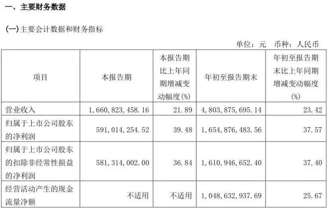 其中,第三季度实现营业收入16.61亿元,同比增长21.89%;归属于上市公司股东的净利润5.91亿元,同比增长39.48%。