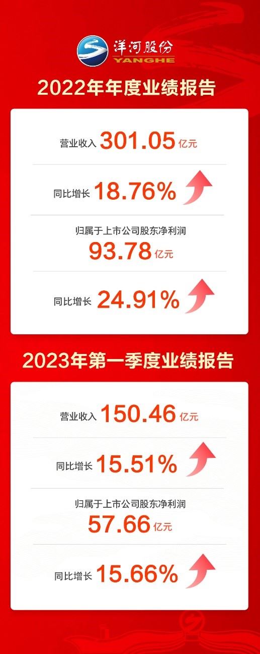 4月25日晚,洋河股份发布2022年年度报告。报告期内,实现营业收入301.05亿元,同比增长18.76%;归属于上市公司股东净利润93.78亿元,同比增长24.91%。同步发布的2023年一季度报显示,一季度实现营业收入150.46亿元,同比增长15.51%;归属于上市公司股东净利润57.66亿元,同比增长15.66%。2022年,面对复杂严峻的宏观环境和极具挑战的市场竞争,洋河股份加快发展、加大转型、加速跨越,实现了“稳中求进、进中有优”的高质量增长。
