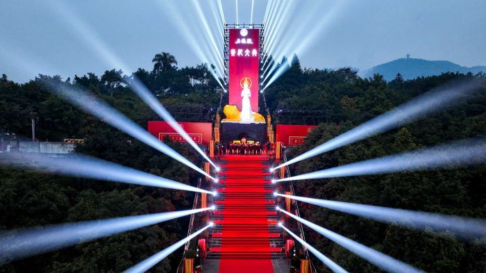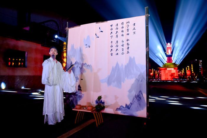 凤舞云端,直上九霄。昆山玉碎凤凰鸣,芙蓉泣露香兰笑。第二篇章《礼》以古乐器、雄浑鼓声、灯光展演为主,在庄重的氛围中,将杜甫、苏东坡、黄庭坚、范成大、陆游等曾造访过宜宾的古代名家以艺术笔触进行情景式融合展演,在一步一景中,将历史重现于眼前,让超越时代的风华与匠心情怀,流淌出无尽的诗意。