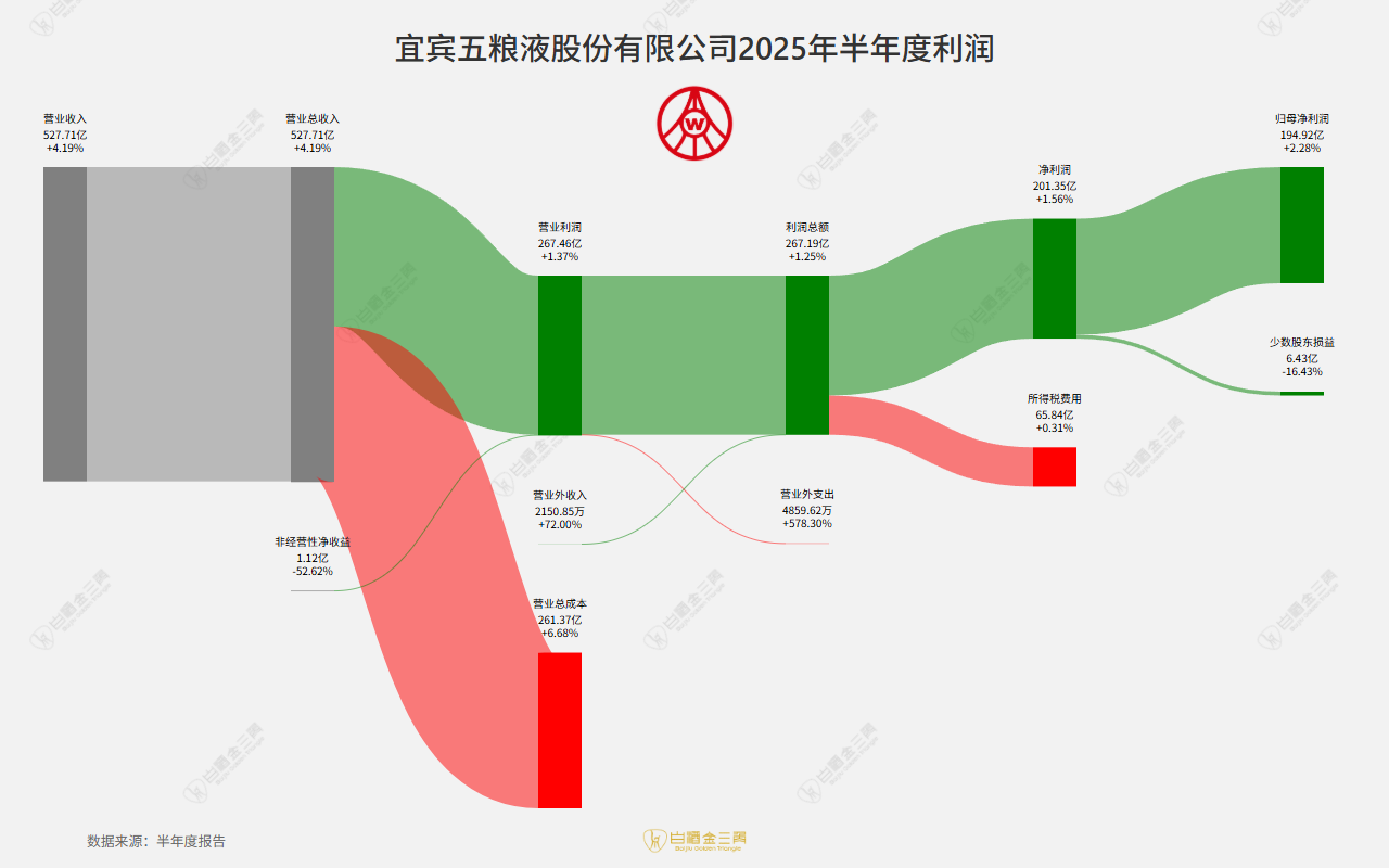 五粮液2025年半年度利润2025年8月28日五粮液(000858)2025年半年度报告信息:公司营业收入527.71亿元,同比增加4.19%;营业利润267.46亿元,同比增加1.37%;归属于上市公司股东的净利润194.92亿元,同比增加2.28%;
