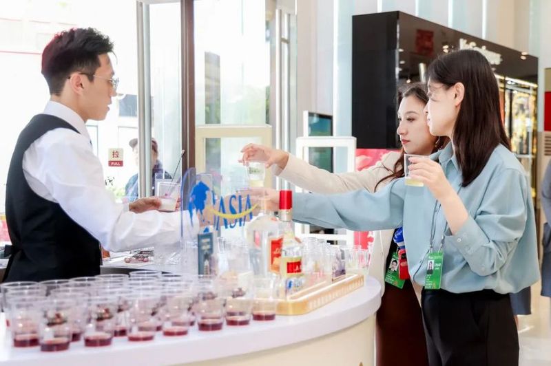 在博鳌免税店“五粮液品牌体验专区”,以五粮液为基酒调配的五款鸡尾酒中西合璧,现场嘉宾纷纷前来品尝体验。