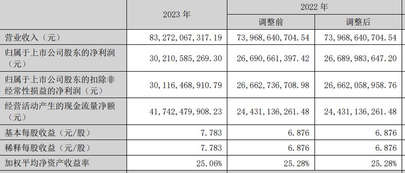 4月28日,五粮液发布了2023年度与2024年一季度业绩报告。报告显示,2023年全年,五粮液实现营业收入832.72亿元,同比增长12.58%;归母净利润302.11亿元,同比增长13.19%。