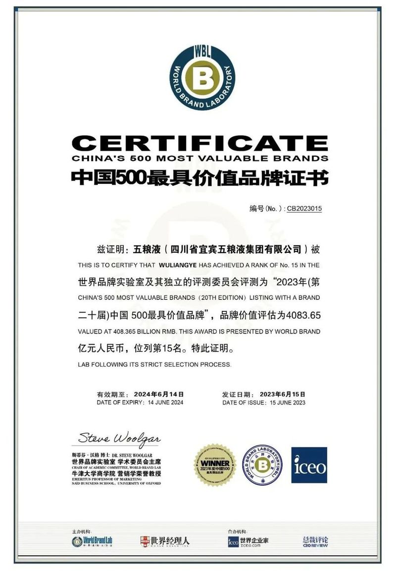 6月15日,由世界品牌实验室(World Brand Lab)主办的“世界品牌大会”在北京举行,2023年《中国500最具价值品牌》榜单及分析报告在会上发布。五粮液以4083.65亿元的品牌价值荣登榜单第15位,品牌价值增长437.46亿元,以12.00%的增幅连续6年保持双位数增长,并获评2023年度最佳表现品牌。同时,五粮液与海尔、徐工等品牌共同入选2023年《中国品牌数字化转型发展案例》。