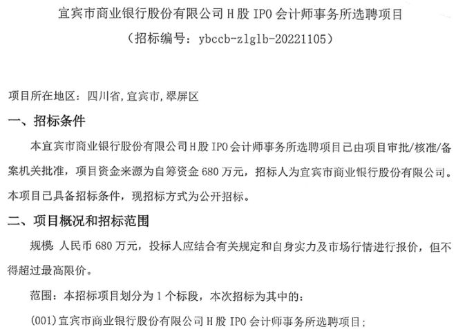 近期,宜宾市商业银行正针对H股IPO项目公开选聘联席保荐机构及主承销商、营销总体协调人,以及IPO会计师事务所。