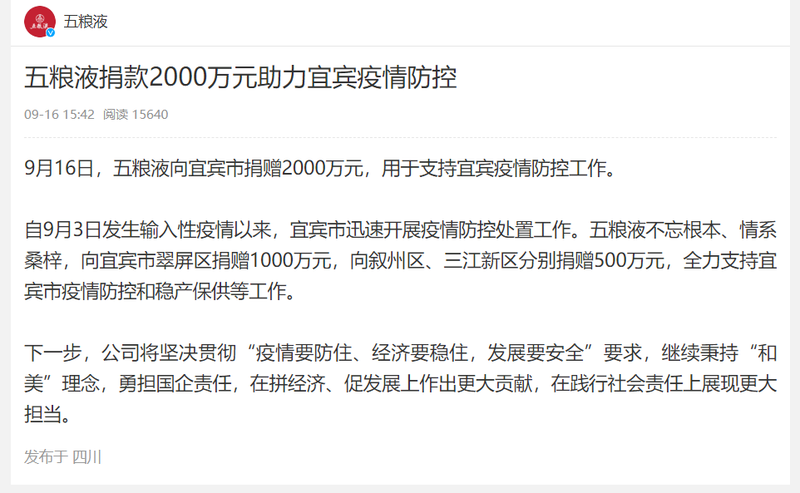 五粮液不忘根本、情系桑梓,向宜宾市翠屏区捐赠1000万元,向叙州区、三江新区分别捐赠500万元,全力支持宜宾市疫情防控和稳产保供等工作。