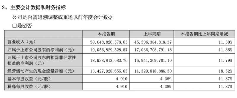8月28日晚间,五粮液发布2024年半年报。报告显示,今年1-6月,五粮液实现营业收入506.48亿元,同比增长11.30%;实现归母净利润190.57亿元,同比增长11.86%。