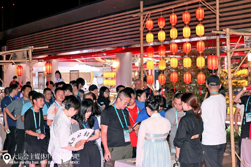 7月27日晚,大运会媒体之夜晚会在快闪酒吧举行,五粮液特调的“和美中国”鸡尾酒、白酒咖啡等饮品跃动在中外媒体嘉宾的舌尖,他们举杯品饮,畅叙友情,传统与现代、中国与世界在这场味觉盛宴上交融互鉴。