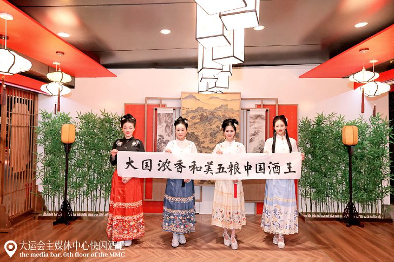 大运会期间,作为中国白酒典型代表和川酒龙头酒企,五粮液在东安书院大运会主媒体中心为国内外媒体嘉宾精心打造集办公、休闲交流、文化体验于一体的大运会快闪酒吧(以下简称“快闪酒吧”),通过三大国风主题日、媒体之夜等活动,展现中华传统文化诗酒茶花、乐舞书画的美好,传递巴蜀韵与中国风的魅力,促进中外文化碰撞与交流,彰显川酒领军品牌助力体育强国建设、弘扬川酒文化的责任与担当。
