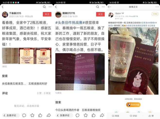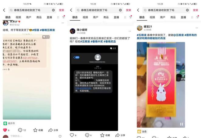 一位来自山东的消费者在今日头条上留言:“我在春晚抽到了三等奖,是一瓶价值近1000元的39度五粮液,当时简直不敢相信!昨天上午,我突然收到一条短信,说五粮液的春晚和美好礼已经发出来了,真的很幸运,很开心!”