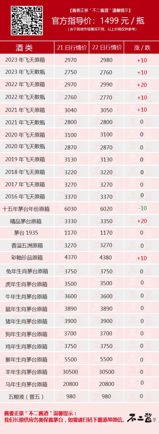 今日茅台酒行情价全览。飞天方面,2021~2023年原箱及2022~2023年散瓶均有10~20元/瓶的涨幅;生肖方面无动价;其他系列中,精品茅台、彩釉珍品涨10~20元/瓶,十五年跌10元/瓶。