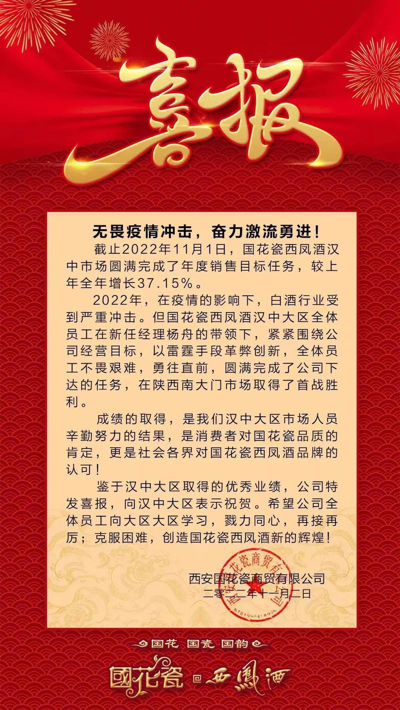 近三年在疫情的影响下,白酒行业受到严重打击。但自8月以来,“国花瓷西凤酒”在陕西白酒市场突飞猛进,喜报频频,无畏疫情冲击,在逆势中实现了自我超越。