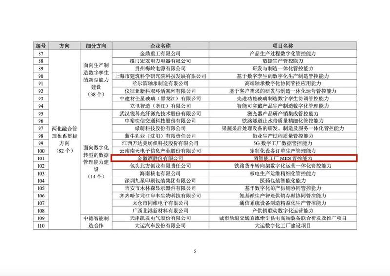 12月14日,工信部公示2023年新一代信息技术与制造业融合发展示范名单,金徽酒股份有限公司(以下简称:金徽酒)申报的“酒智能工厂MES管控能力”项目成功入选。这是对金徽酒持续推动数字化转型升级,助力酒业数字化高质量发展的高度肯定。