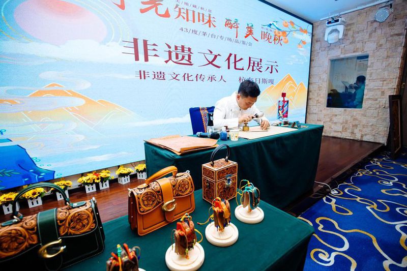 同优质白酒的工艺一样,一件完美的蒙古族皮艺作品需经过描绘、雕刻、着色、层染、烫色、抛光、定形,半浮雕凹凸压制等一系列工序,需纯手工完成几十道工艺才可制作完成。此次茅台内蒙古地区核心经销商乾尊云峰商贸公司将茅台酱香酒的传统“12987”工艺和同样具备工匠精神的蒙古族皮艺进行了跨地域、跨文化的交流互通,让与会嘉宾深刻感受到了茅台在文化挖掘方面的企业大爱。