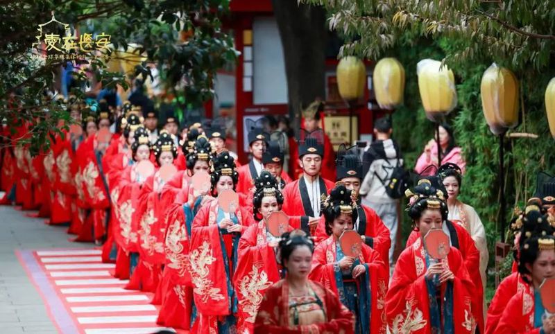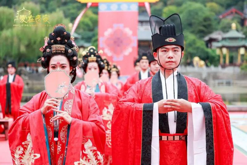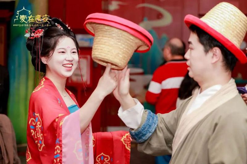 数十对爱侣们在长安十二时辰主题街区,变身“唐潮人”,穿着华服、漫步盛唐市井。在这个最接近真实的唐朝长安时空,体验者们突破时间、空间的限制,沉浸式体验唐长安城在每一个时辰里的不同存在状态,欣赏唐朝仕女演艺霓裳羽衣舞等表演,与“李白”饮酒作诗,品尝唐长安美食。