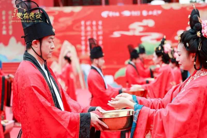 同牢礼环节,爱侣们共食同一个器皿中的食物,代表新人从此共同生活在一起,共食同枕,同心同德。随后,爱侣们行合卺礼,共饮西凤美酒,寓意着夫妇一体,天长地久。此次“爱在长安”2024全球华服集体婚礼(第一季),通过沉浸式的传统婚典体验,从礼仪、服饰、诗词、礼乐,全方位再现中华衣冠上国,礼仪之邦的隽永文明。