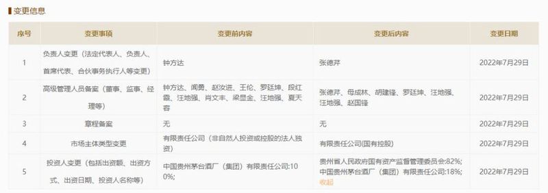 据国家企业信用信息公示系统等多家企业信息查询网站显示,7月29日,贵州茅台酒厂(集团)习酒有限责任公司(下称习酒公司)发生工商变更,原股东中国贵州茅台酒厂(集团)有限责任公司持股比例由100%变更为18%,新增贵州省人民政府国有资产监督管理委员会为股东,持股82%。