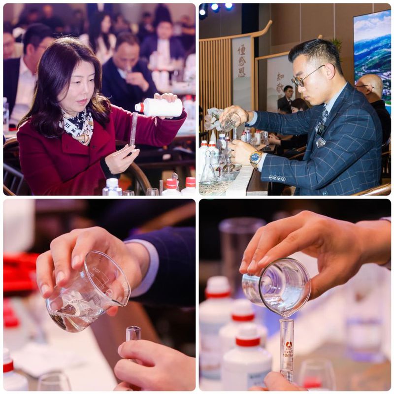 勾调环节,宾客们取出精美的勾调器具,调配适当比例的年份基酒与陈年老酒,亲手制作出属于自己的勾调作品。大家在一品一调之间,沉浸式体验习酒的品鉴之道、勾调之美,探寻这“三分物质、七分精神”“三分艺术、七分技术”的深奥学问。