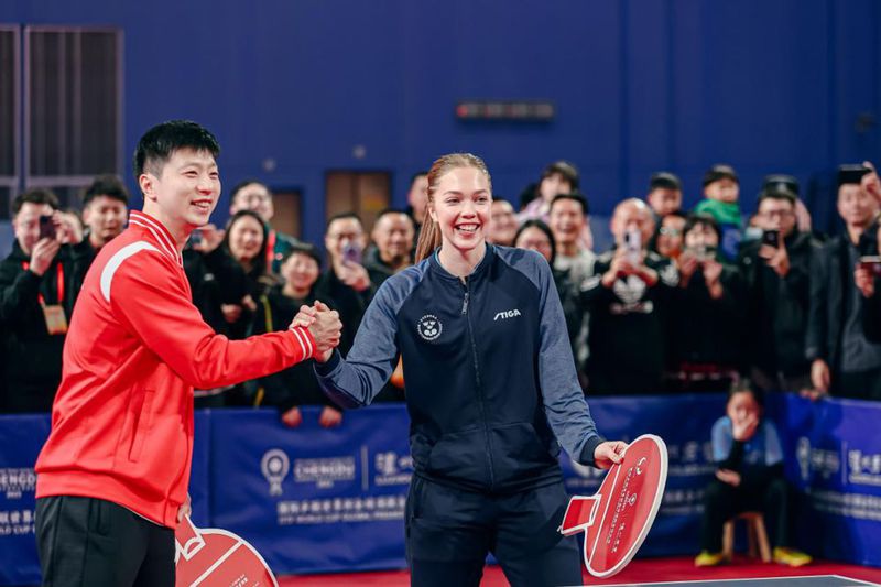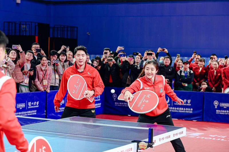 12月2日下午,奥运冠军、乒乓球运动员马龙、陈梦,瑞典著名乒乓球运动员克里斯蒂娜·卡尔伯格和韩国著名乒乓球运动员林仲勋,在成都进行了一场“明星表演赛”,吸引了大量球迷现场助威观战。