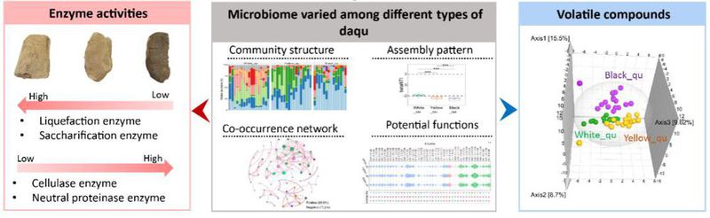 本研究通过非靶代谢组分析、高通量测序等技术,系统分析白曲、黄曲和黑曲的酶学性质、菌群结构及其功能和挥发性物质,并发现发酵温度是影响大曲微生物群落形成与功能,造成大曲品质差异的关键因素。白曲具有较高的液化力和糖化力,黑曲的中性蛋白酶和纤维素酶酶活力较高,而黄曲的多种酶活力适中,是酱酒生产中用量最多的大曲,通常占总量的80%以上。