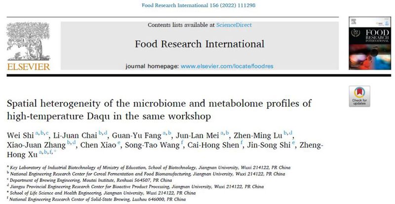 近日,江南大学许正宏教授团队与国家固态酿造工程技术研究中心沈才洪正高工团队联合在国际食品科技专业TOP期刊《Food Research International》(IF:6.475)上发表了题为“Spatial heterogeneity of the microbiome and metabolome profiles of high-temperature Daqu in the same workshop”的研究论文,即“同一车间高温大曲微生物组和代谢组的空间异质性”。