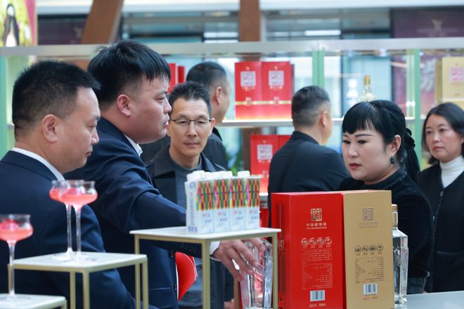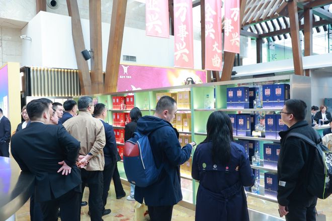 展厅内所有洽谈区、休息区坐满了前来鉴赏产品、交流合作的经销商;樽系列、彩系列展台前人流不断;“宴品全兴 万事兴”品牌标语引多人围观拍照……