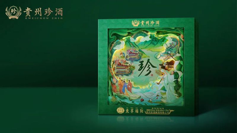 珍十五·竞享端阳瓶身通体碧绿,名画佳作点缀其中。整体设计以故宫博物院藏品《雍正十二月行乐图》轴之《五月竞舟》为灵感来源,以屈原手执画笔描绘端午竞舟为创意,突出“珍”字品牌符号,呈现出欢度端午的热闹情景,洋溢着欢乐祥和的节日气氛。