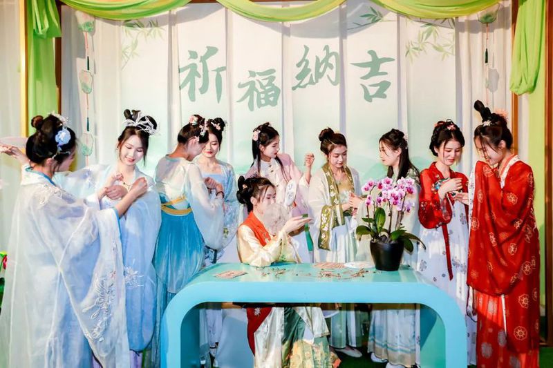 参会嘉宾身着精美汉服,穿梭于市集之中,可亲身参与香氲林语、芬蕴端阳、投壶有礼、粽享端午、箭射五毒、珍宝坊、逐光随影等活动,体验香囊手作、艾草花束手作、纸雕夜灯手作、趣味投壶、射五毒等传统端午民俗项目,可谓是“穿越时空”,梦回盛唐端午佳节的场景。