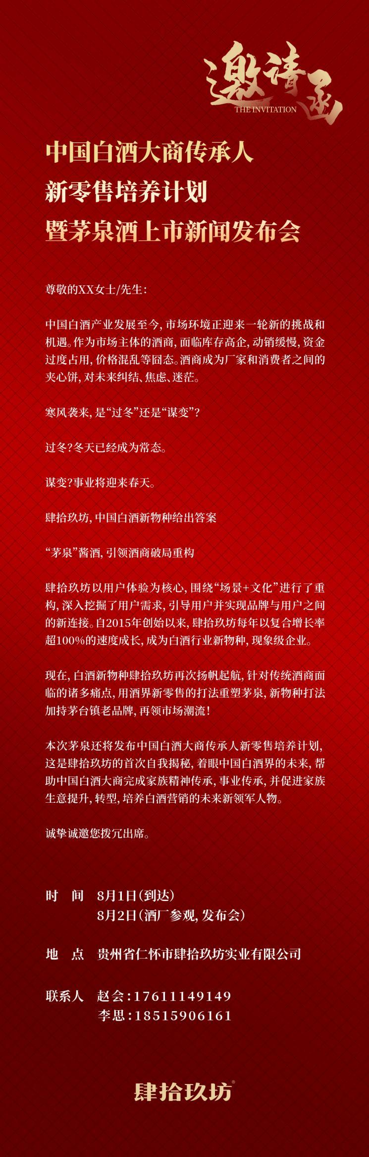 8月1日,肆拾玖坊将在贵州仁怀举办“中国白酒大商传承人新零售培养计划暨茅泉酒上市新闻发布会”,给众多经销商分享酒业新玩法。