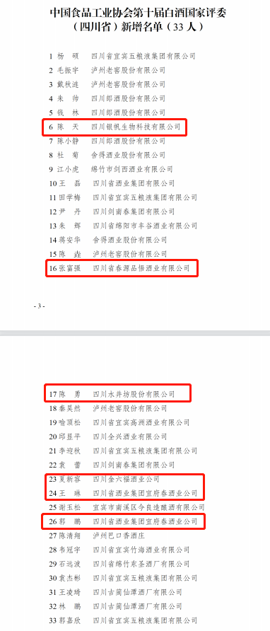 而在近期中国酒业协会发布的“2022届国家级露酒评委委员”名单中,来自川酒成都产区·邛崃的四川省宏达酒业有限公司刘林琼、四川宜府春酒厂有限责任公司郭鹏和王雅彬、四川金满楼酒业有限公司张毅、四川银帆生物科技有限公司梁颖、四川邛崃金六福崖谷生态酿酒有限公司周睿琳、四川琴台酿酒有限公司陈萍、四川省渔樵(集团)有限公司王彬等8位获评。
