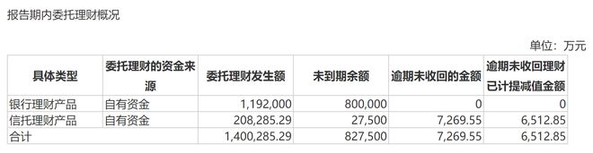 洋河股份2022年财报显示,公司在报告期内以自有资金委托理财的发生额共计140亿元,其中信托理财产品约20.83亿元,对逾期未收回理财计提了6512.85万元减值;银行理财产品约119.2亿元。