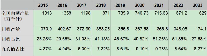 根据酒发局数据,宜宾白酒已经表现不俗。2023年,宜宾规上白酒企业营收突破1800亿元、利润突破400亿元,营收和利润均实现两位数增长,宜宾一个产区占据了全国白酒行业四分之一的营收和六分之一的利润。以2023年全国白酒产量629万千升计,2023年宜宾规上白酒企业产量不超过52万千升。
